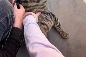 流浪猫被人用绳子紧紧绑住了肚子,女子发现后立即剪开绳子
