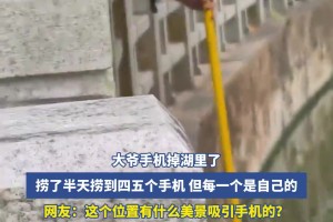 大爷手机掉湖里了,捞了半天捞到四五个手机,但没一个是自己的
